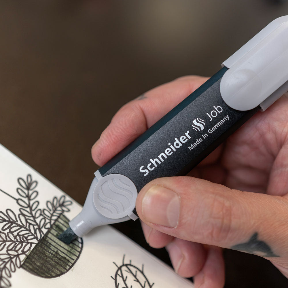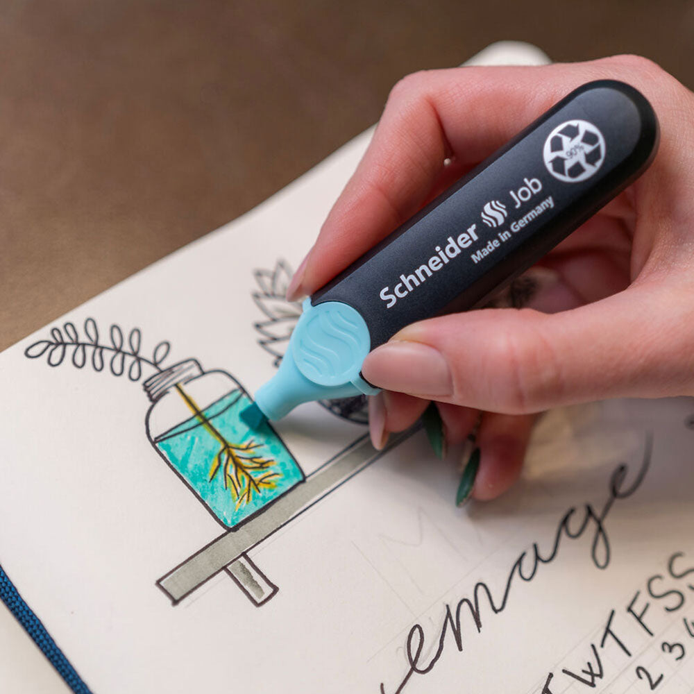 The highlighter Job has been awarded the Blue Angel environmental label and offers excellent marking performance for writing, underlining, or highlighting entire paragraphs, it can highlight up to 15 000 words! With the chisel tip, important passages can be either underlined or highlighted, while the text underneath remains legible. The chisel tip allows for variable line widths from 1 to 5 mm.