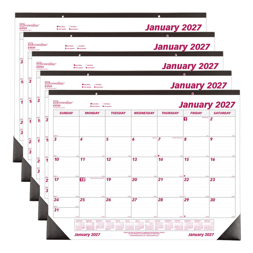 Take on the year one month at a time with the Brownline® Monthly Desk Pad Calendar, spanning 12 months, January to December 2027. One month per sheet, one lightly ruled block per day (Sunday-Saturday) for straightforward planning. Vinyl corners help keep pages in place. Reinforced chipboard backer provides a sturdy writing surface. Perforated sheets for easy tear-off, bound at the top. Two-hole punched for hanging. Convenient 14-month reference calendar on each sheet for quick date verification and long-term planning. Features: numbered weeks, countdown of days passed and days to come (Julian dates), highlights holidays and phases of the moon. Non-refillable pad. English, size: 22" x 17". Brownline® is the brand of choice when it comes to selection and affordability. Used in the office, home or classroom, the extensive line of Brownline® dated products offers the widest variety of formats and constructions to meet every possible need. Brownline® Dated Products are produced using acid-free paper to prevent color-change over time and vegetable oil-based inks to help protect the environment. Brownline® since 1846. (C1731)