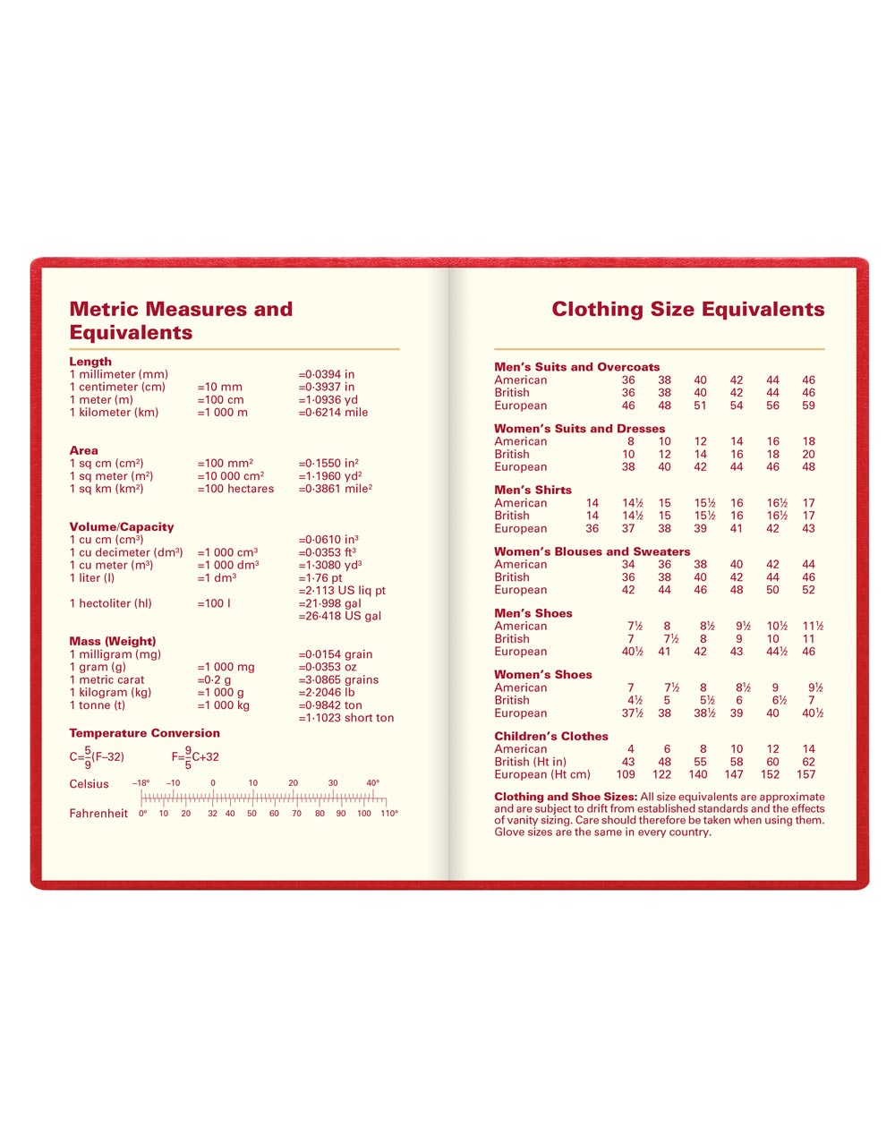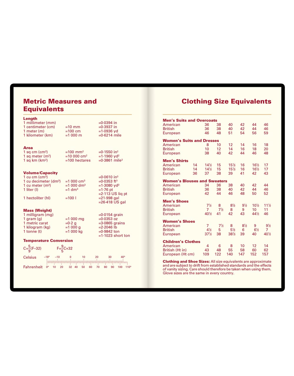 • clothing size equivalents