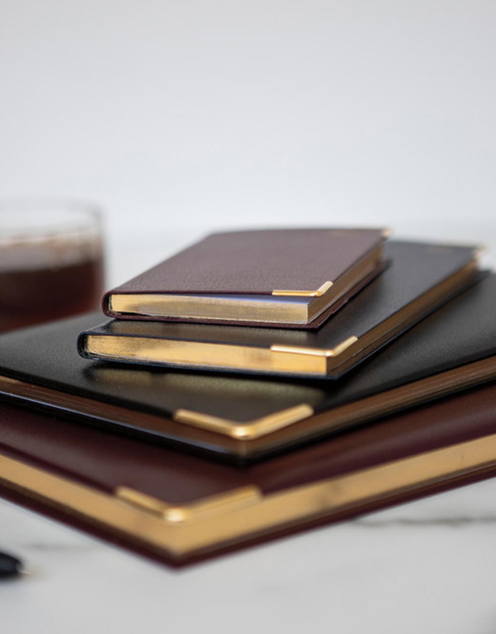 Complete your goals with this elegant faux-leather Slim size landscape planner. Beautifully accented with matching gold corners and gilt foiled paper edges. Week to view layout with appointment times.English.